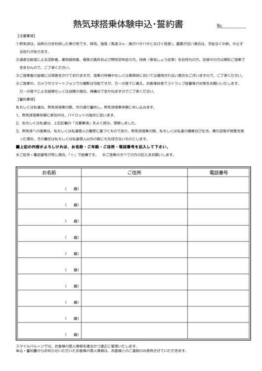 ページ下部その他の誓約書を当日記入いただきます。必ず御確認の上、