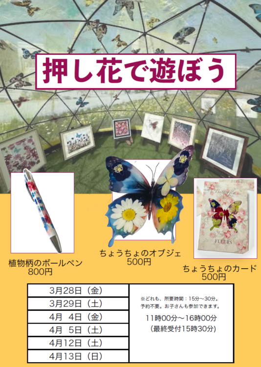 植物柄のボールペンやちょうちょのオブジェ、ちょうちょのカードの押し花作品づくりワークショップを開催します。お子さまも参加できます。