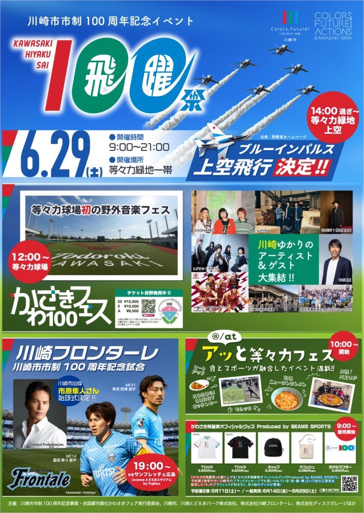 市制100周年を祝い、かわさきゆかりのアーティストが集結する「かわさき100フェス」、スポーツ体験や食などで1日を通じて楽しめる「アッと等々力フェス」、川崎フロンターレの「市制100周年記念試合」が行われる『かわさき飛躍祭』が6月29日(土)に等々力緑地一帯で開催されます。