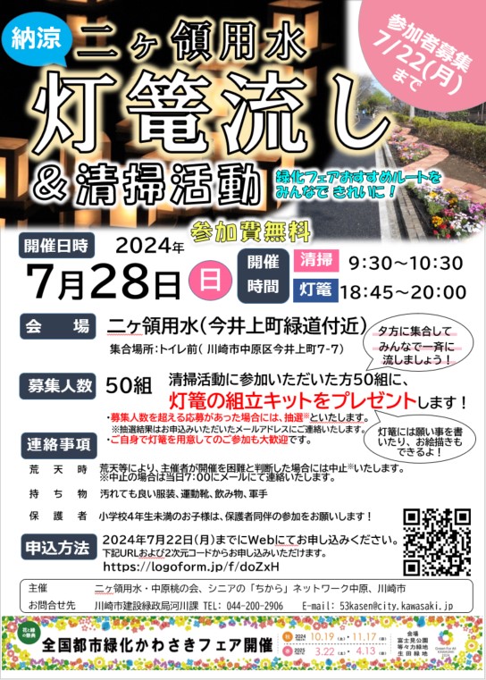 【7月28日】ニヶ領用水で灯篭流し&清掃活動を行います。