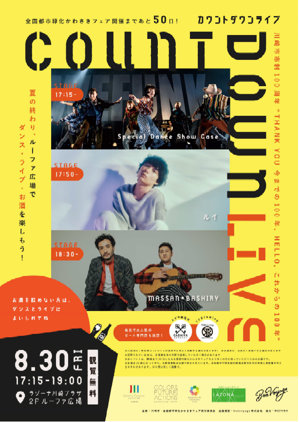全国都市緑化かわさきフェアと連携して、“COUNT DOWNLIVE”と題し、アーティスト等による歌やダンス、飲食スペース等を提供し、若者を中心に、多くの来場者とともに、市制100 周年を盛り上げ、かわさきフェアに向けた機運醸成を図るイベントを開催いたします。