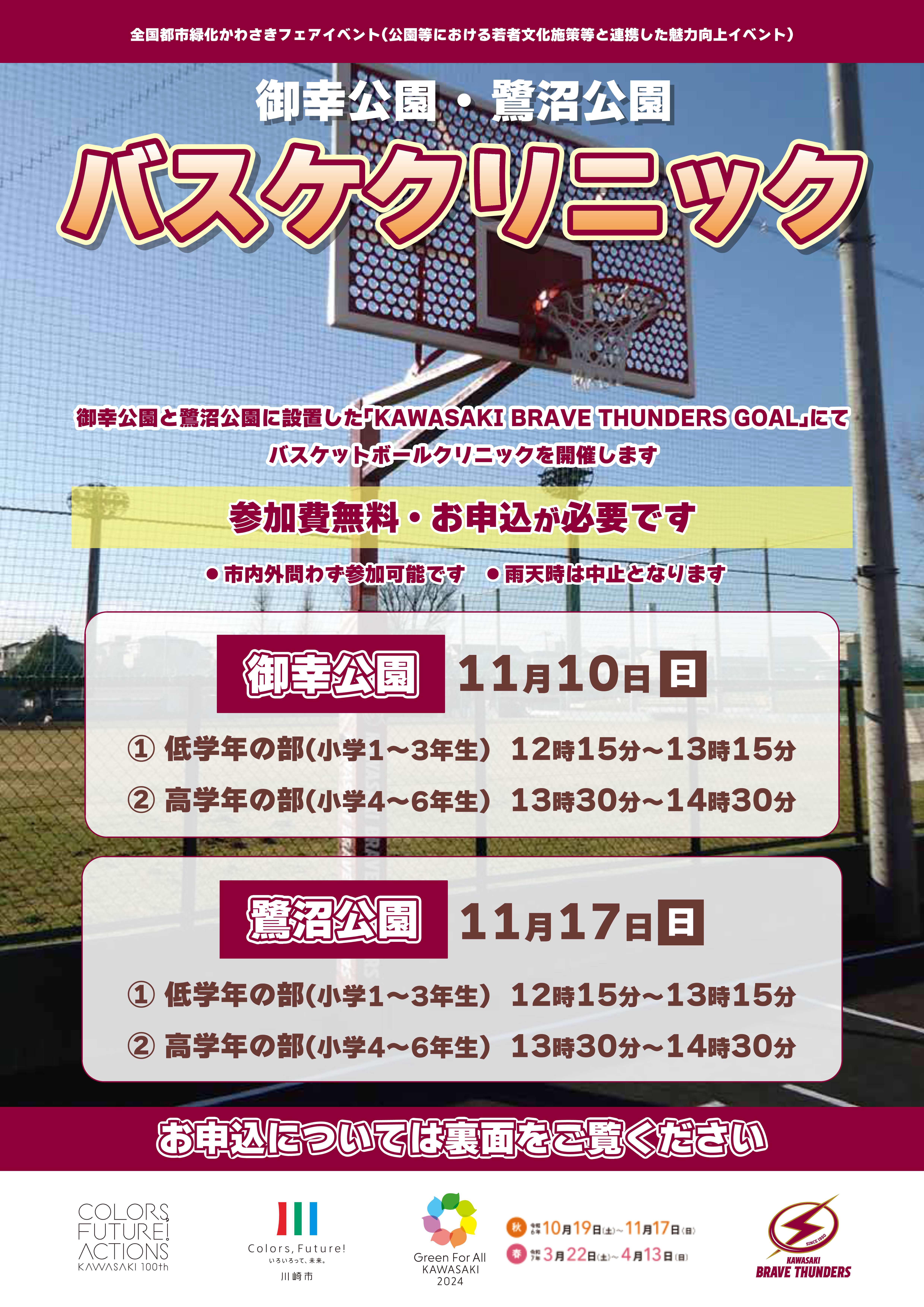 御幸公園と鷺沼公園に設置した「KAWASAKI BRAVE THUNDERS GOAL」にてバスケットボールクリニックを開催します!