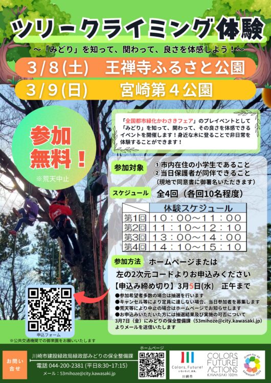 【3/8(土)、3/9(日)】王禅寺ふるさと公園と宮崎第4公園にてツリークライミング体験を実施します!