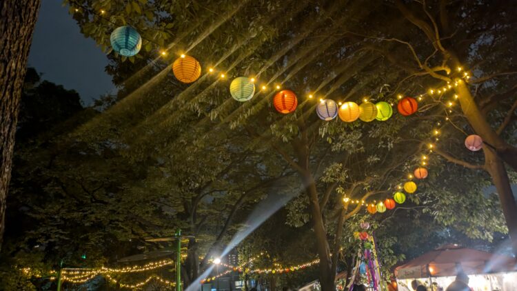 メインガーデンから芝生広場へ続く道をイルミネーションが暖かく彩る。デコレーションされた桜並木やイチョウのなかを歩く。