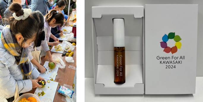 川崎市産の柑橘の皮むき体験・蒸留した柑橘の精油とブレンドしたアロマスプレー製作