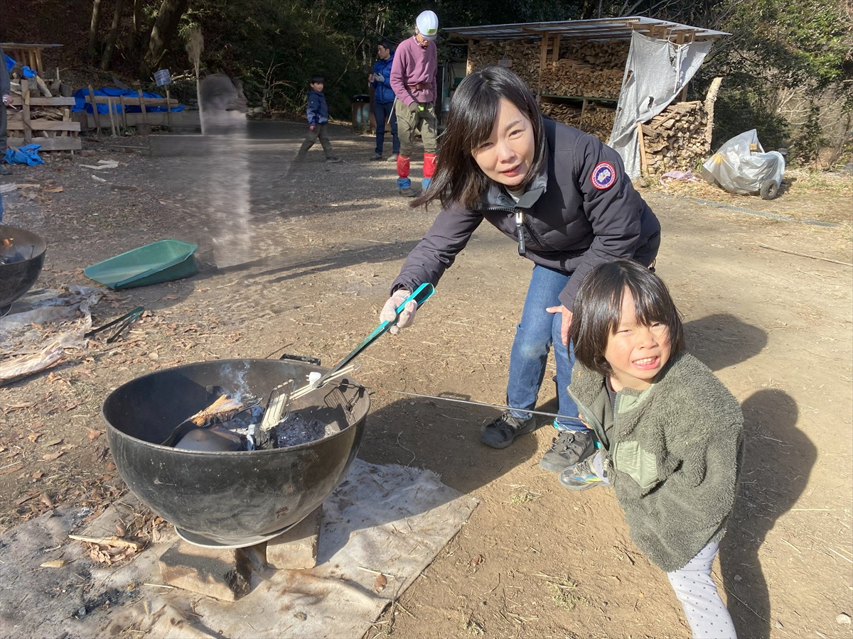 薪を割って火を起こし、焼き芋や焼きマシュマロを頬張って、里山を満喫しています。