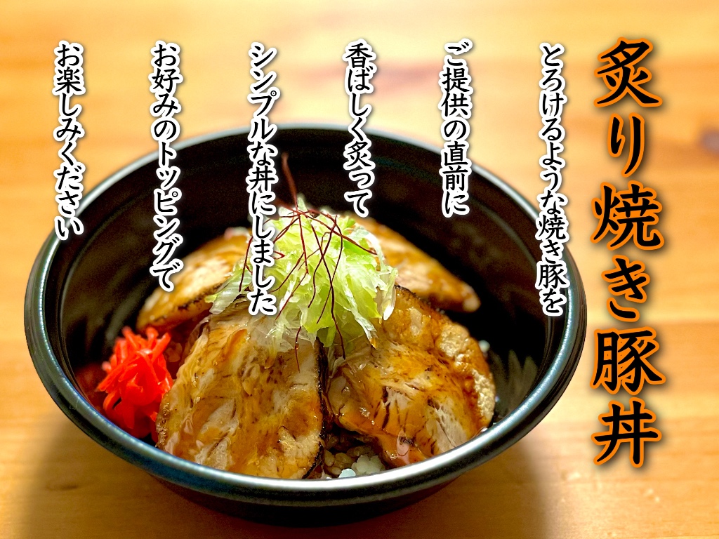 じっくり丁寧に作った自家製のトロトロの焼き豚をご提供の直前に香ばしく炙って丼にしました。お好みのトッピングを組み合わせ自分だけのオリジナルでお楽しみください。